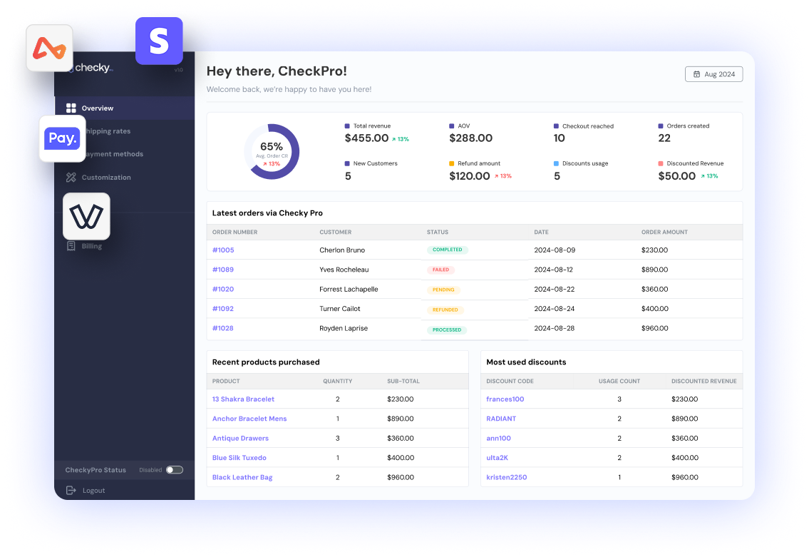 With Checky Pro you see your business in real time. The dashboard shows revenue, order value, checkouts, orders and new customers.